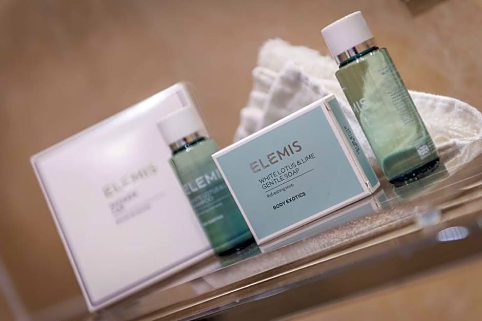 Features include a flat-screen TV, 24-hour room service, and an private bathroom with upgraded toiletries and a hairdryer.